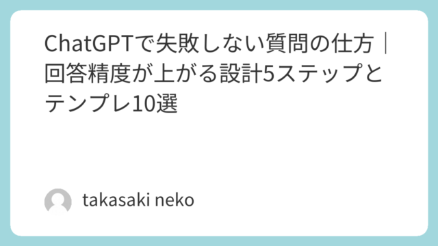 ChatGPT活用 ChatGPTで失敗しない質問の仕方|回答精度が上がる設計5ステップとテンプレ10選 ChatGPTで『思った答えが返らない』原因は質問(プロンプト)設計にあることが多いです。失敗の原因、NG例→改善例、回答精度を上げる設計5ステップ、コピペで使えるテンプレ10選、改善ループ、注意点(個人情報・著作権)まで初心者向けに解説。 2025.12.17 ChatGPT活用